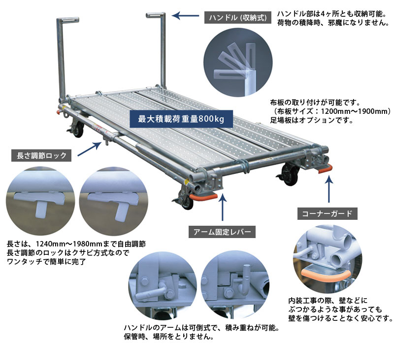 オプション利用で、多彩なバリエーション。台車1台で、いろいろな資材や現場に対応可能!