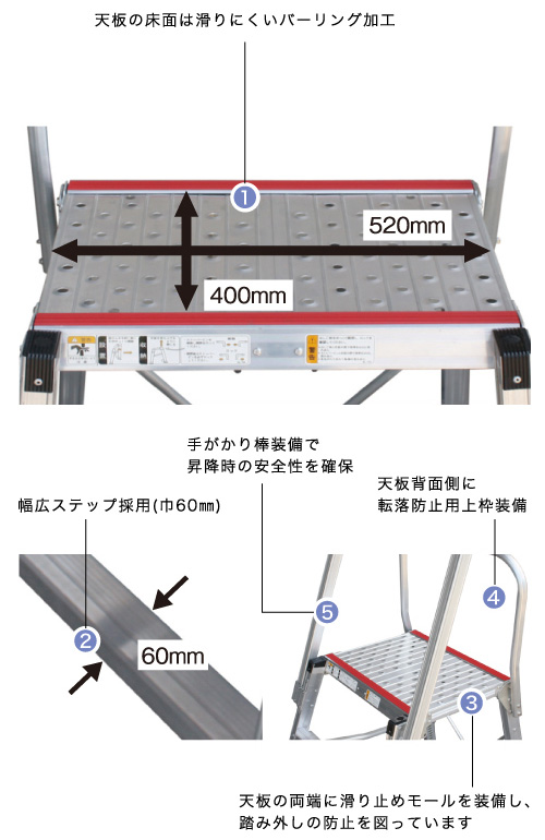 B 天板両端に滑り止めモールを装備し、踏み外しの防止を図っています。